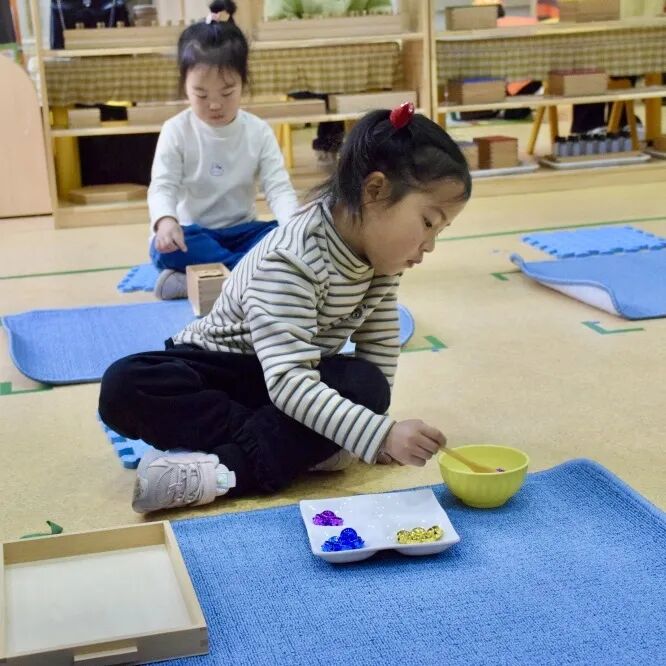 蒙氏区域活动和传统课程不同,在这里孩子自主选取自己就近发展区的材料操作,老师充分尊重每个孩子的成长步调。